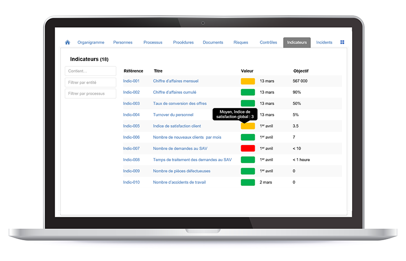 - Relations dynamiques et cartographie des indicateurs avec tous les éléments de l’organisation interne (processus, risques, plans d’action, etc.)