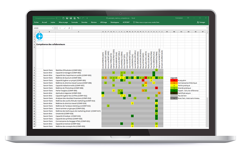 - Relations dynamiques et cartographie des compétences avec tous les éléments de l’organisation interne (collaborateurs, processus, prestations, risques, etc.)